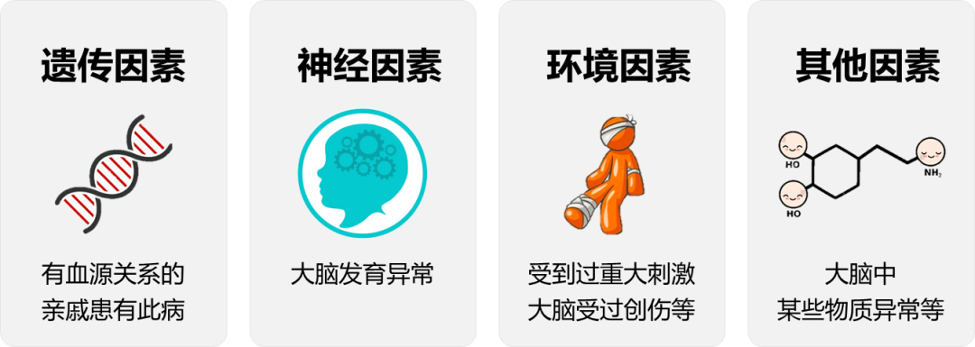 遗传因素影响显著,近亲中有患者的个体,自身发病风险会明显升高;神经递质失衡(如多巴胺、血清素水平异常)、脑结构改变(如海马体体积缩小或增大)等,均与发病密切相关。