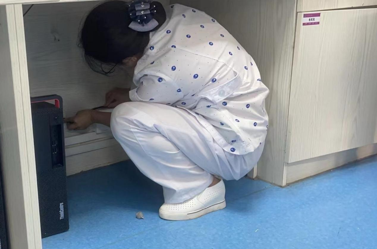 护士站的桌下线路曾如蛛网般杂乱,不仅影响环境整洁,更暗藏安全隐患。黄护士俯身蹲下,在狭小的空间内半跪半趴,小心翼翼地将缠绕的线路逐一理清,再按照功能和走向分类,棕色的路由器线路、黑色的电脑、打印机线路……每一根都被她耐心梳理。汗水浸湿了额发,她却丝毫不在意,仍专注地用理线带将每根线路整齐捆扎。