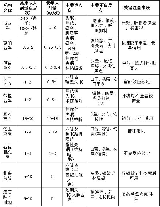 镇静催眠药的选择应根据临床需要。有效的催眠药应具有吸收快、作用时间短、在体内清除快、无蓄积等特点。苯二氮类药较安全,依赖性小,长期应用戒断症状轻,过量时也易被唤醒。对入睡困难者应选用吸收快、起效快的药物,如咪达唑仑;对早醒者应选用吸收较慢、作用时间长的药物,如氯硝西泮;上述两种症状并存者可选用氟西泮。对睡眠中断者可选用扎来普隆。对处于焦虑状态的睡眠障碍患者,可选择抗焦虑药中的阿普唑仑、氯硝西泮或劳拉西泮。